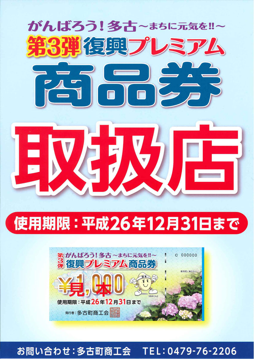ご好評いただいている『第3弾 復興プレミアム商品券』ですが、使用期限は平成26年12月31日となっております。